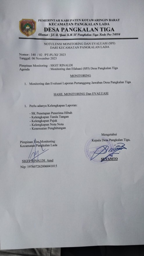 Selasa, 7 November 2023, Kunjungan Monitoring Kecamatan Pangkalan Lada untuk pelaporan tahun 2022 Desa Pangkalan Tiga