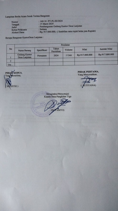 Hari ini kamis, 15 Maret 2024 Pemerintah Desa Pangkalan Tiga melaksanakan serahterima bangunan kantor desa lanjutan antara Ketua Tim pelaksana pembangunan bapak Sutiyana dengan Kaur Umum dan Perencanaan di ketahui oleh Kepala Desa Pangkalan Tiga.